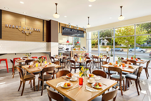 O rés do chão da mais recente Org Ideal do Estado da Estrela Solitária brilha com janelas do chão ao teto, e vai oferecer uma receção amigável, dando umas boas‑vindas texanas a mais de 70 000 pessoas que passam pela rua todos os dias.