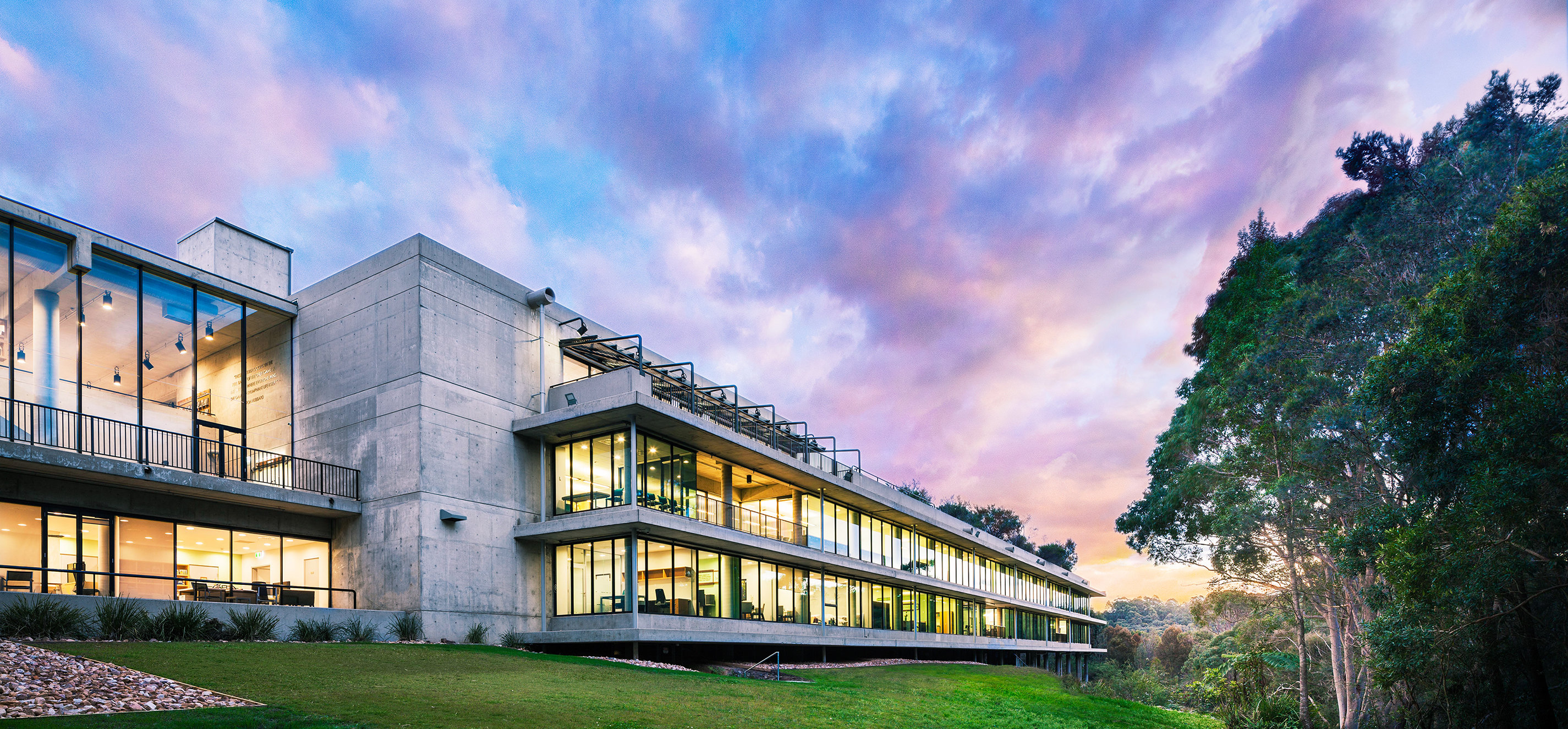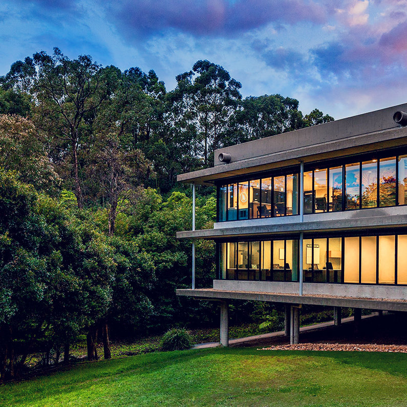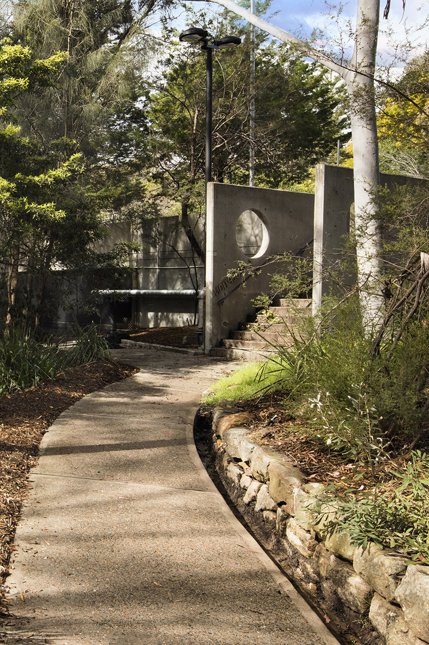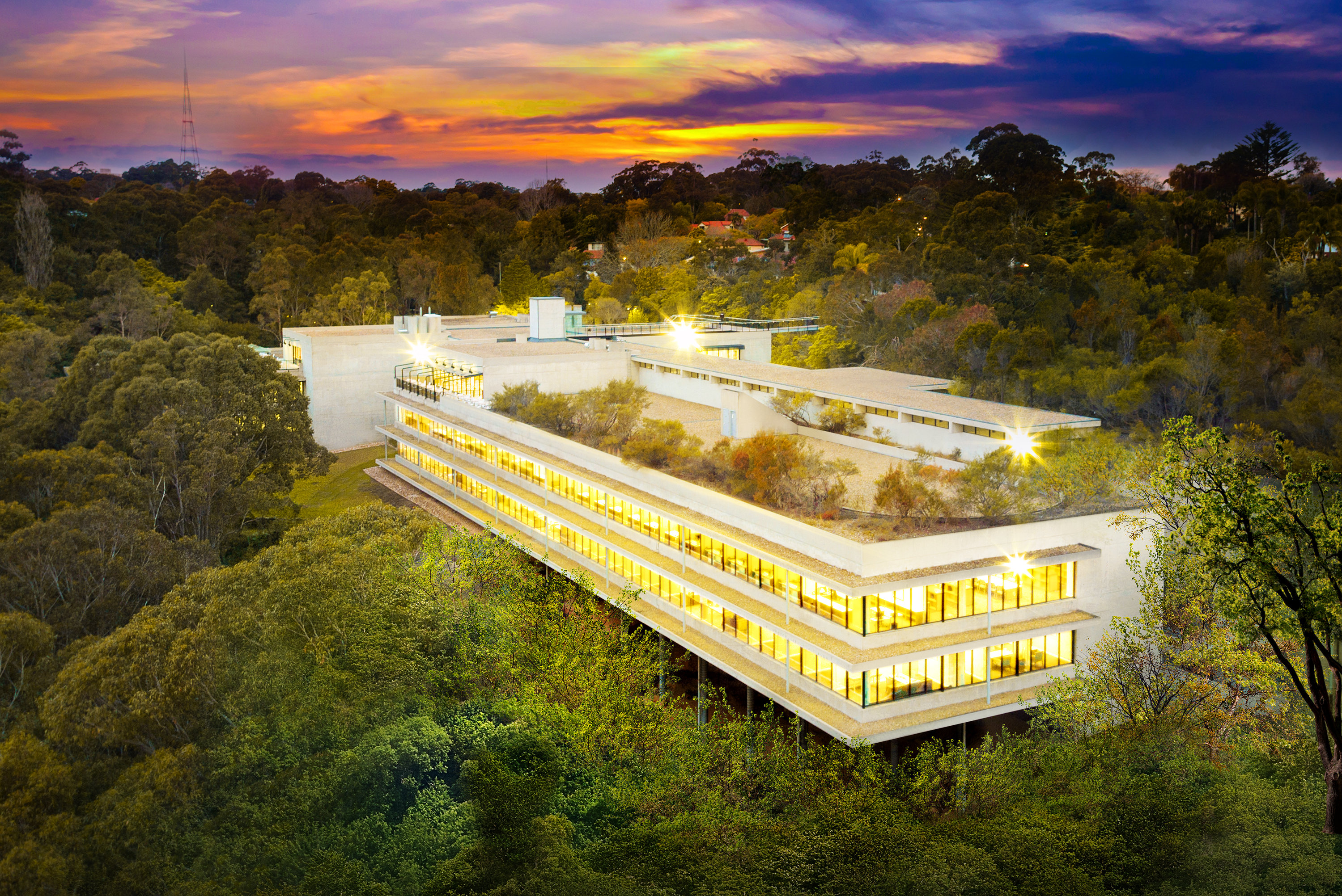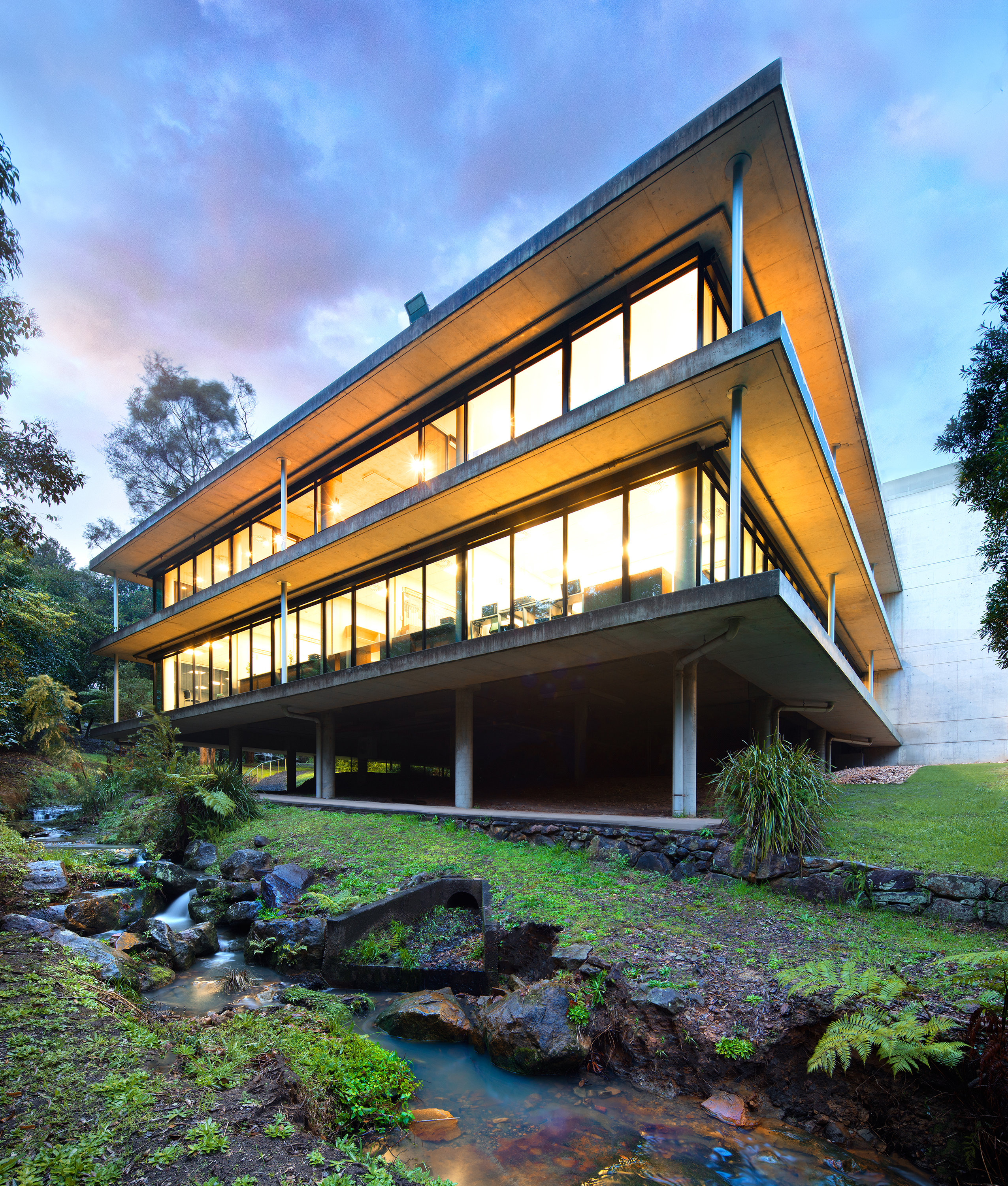A estrutura ultramoderna apresenta um estilo minimalista com vários andares de vidro para uma impressionante paisagem de betão. Lá fora, a Blue Gum Creek segue a sua jornada através de 3 hectares de floresta de eucalipto nativo, literalmente um Jardim do Éden no centro da área metropolitana de Sydney.