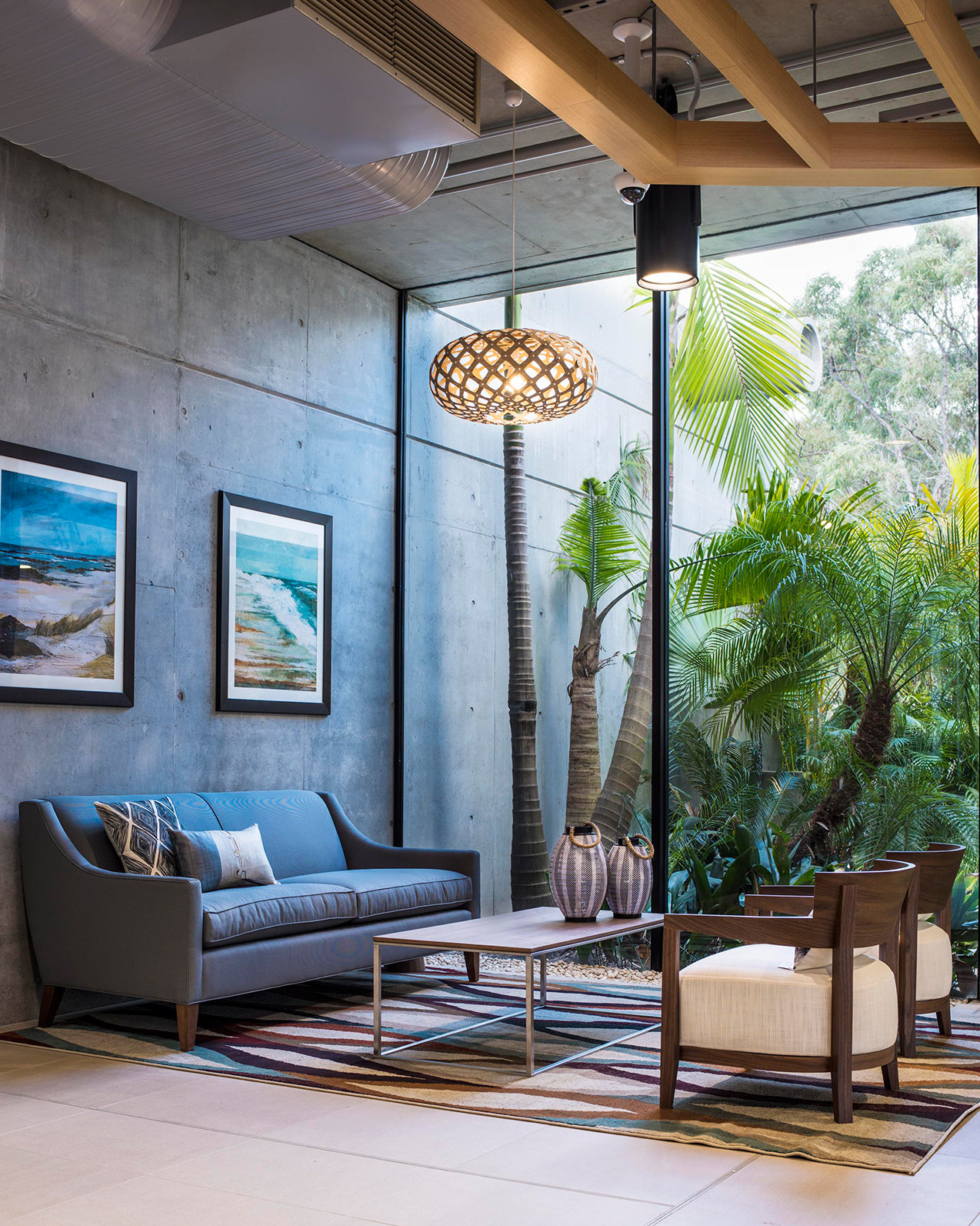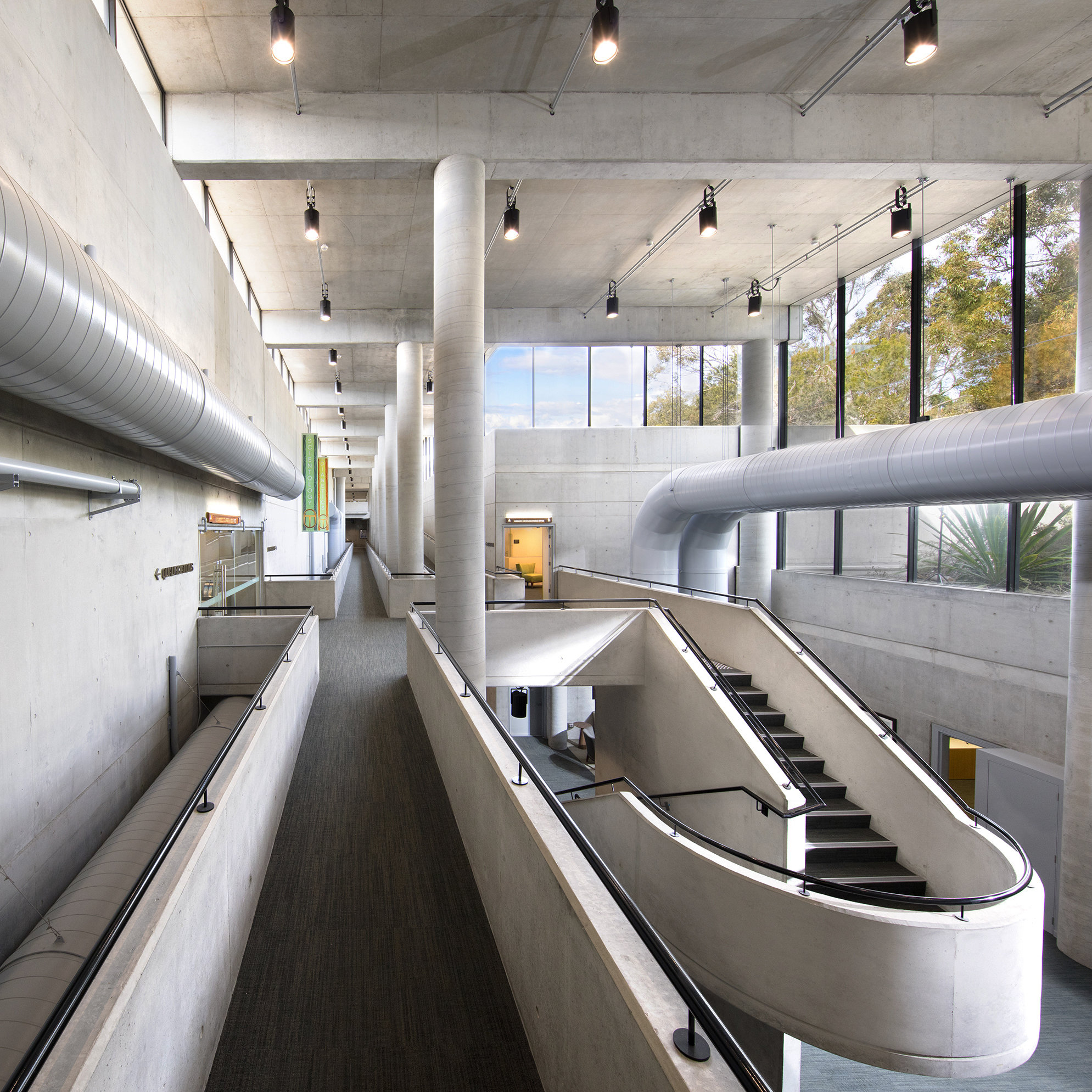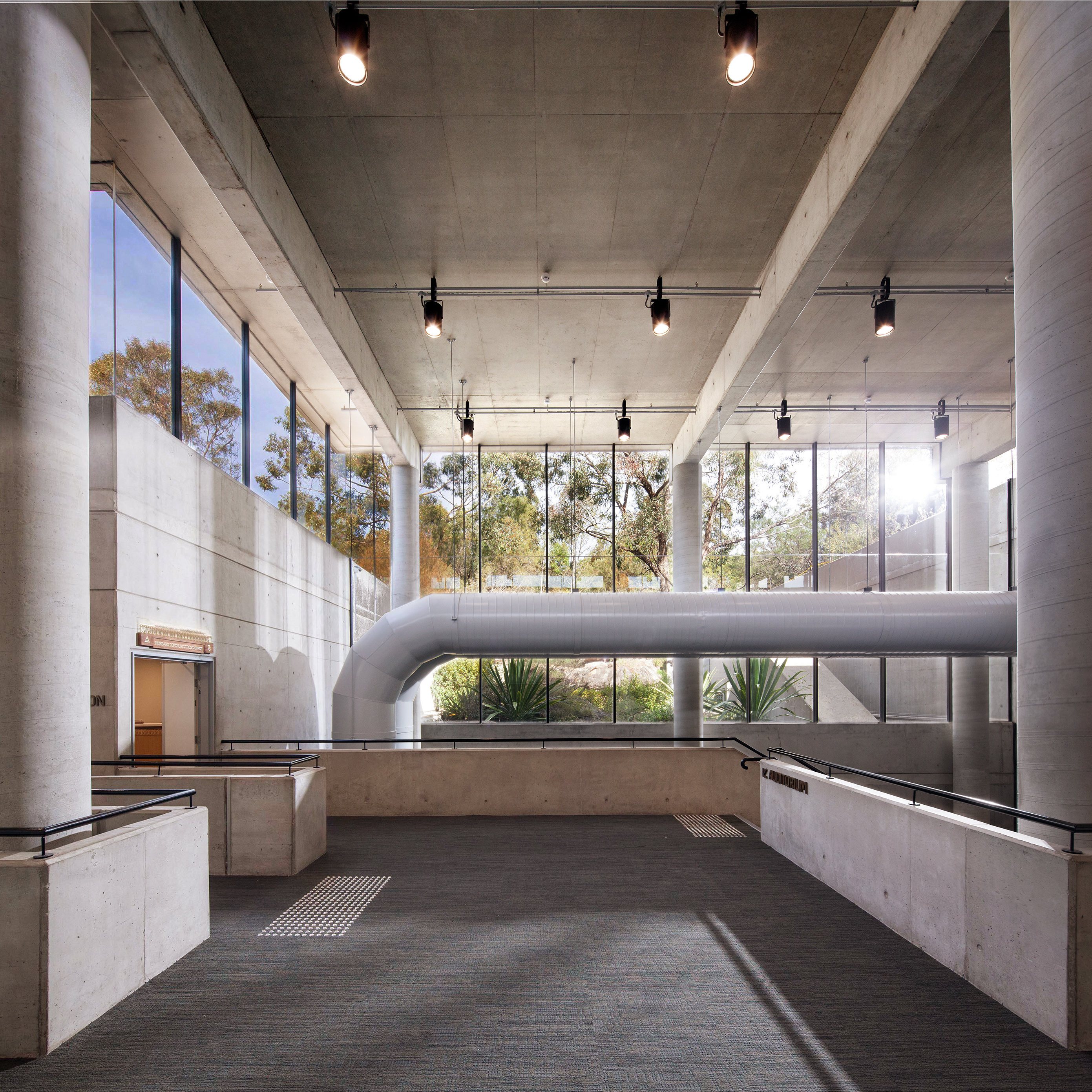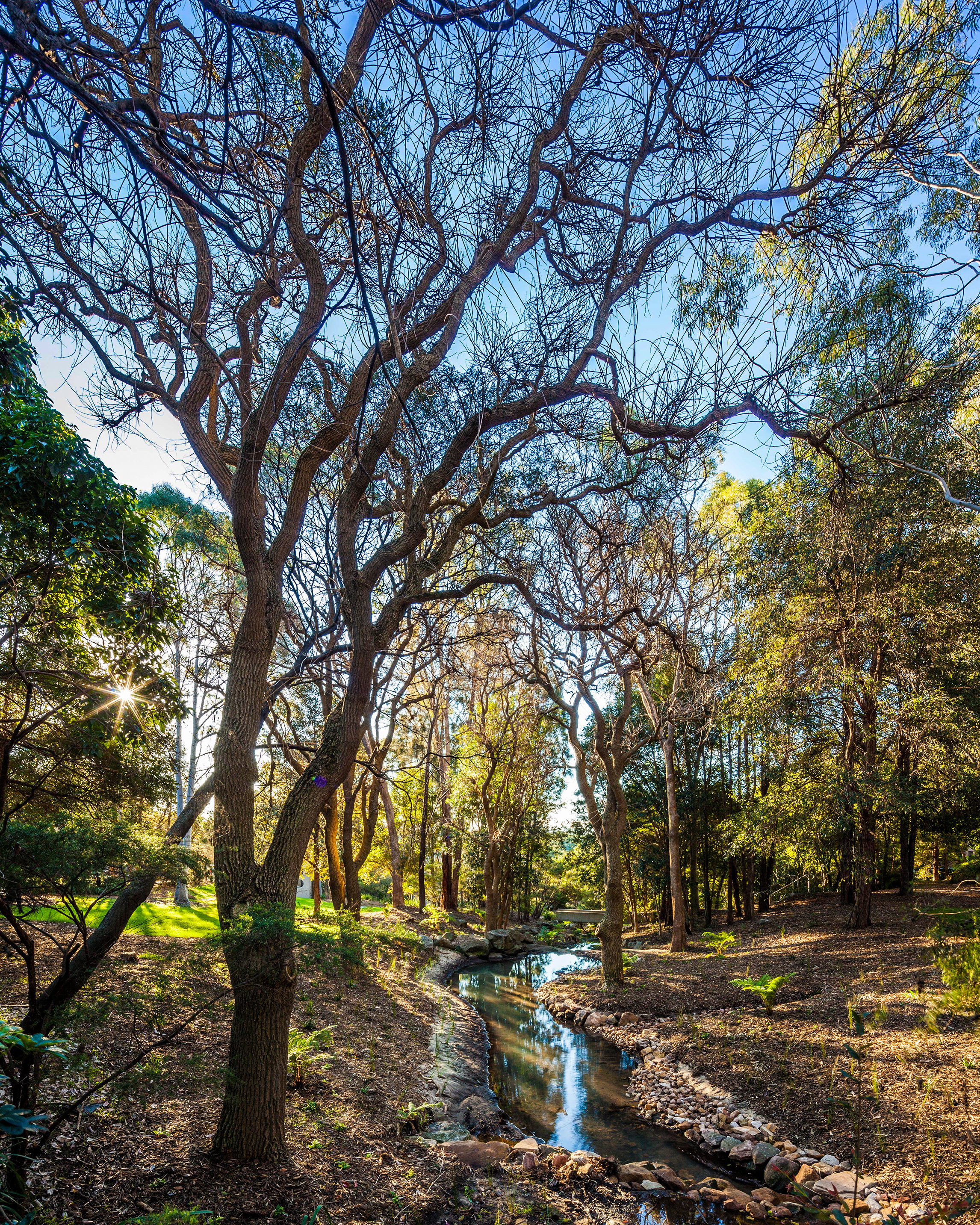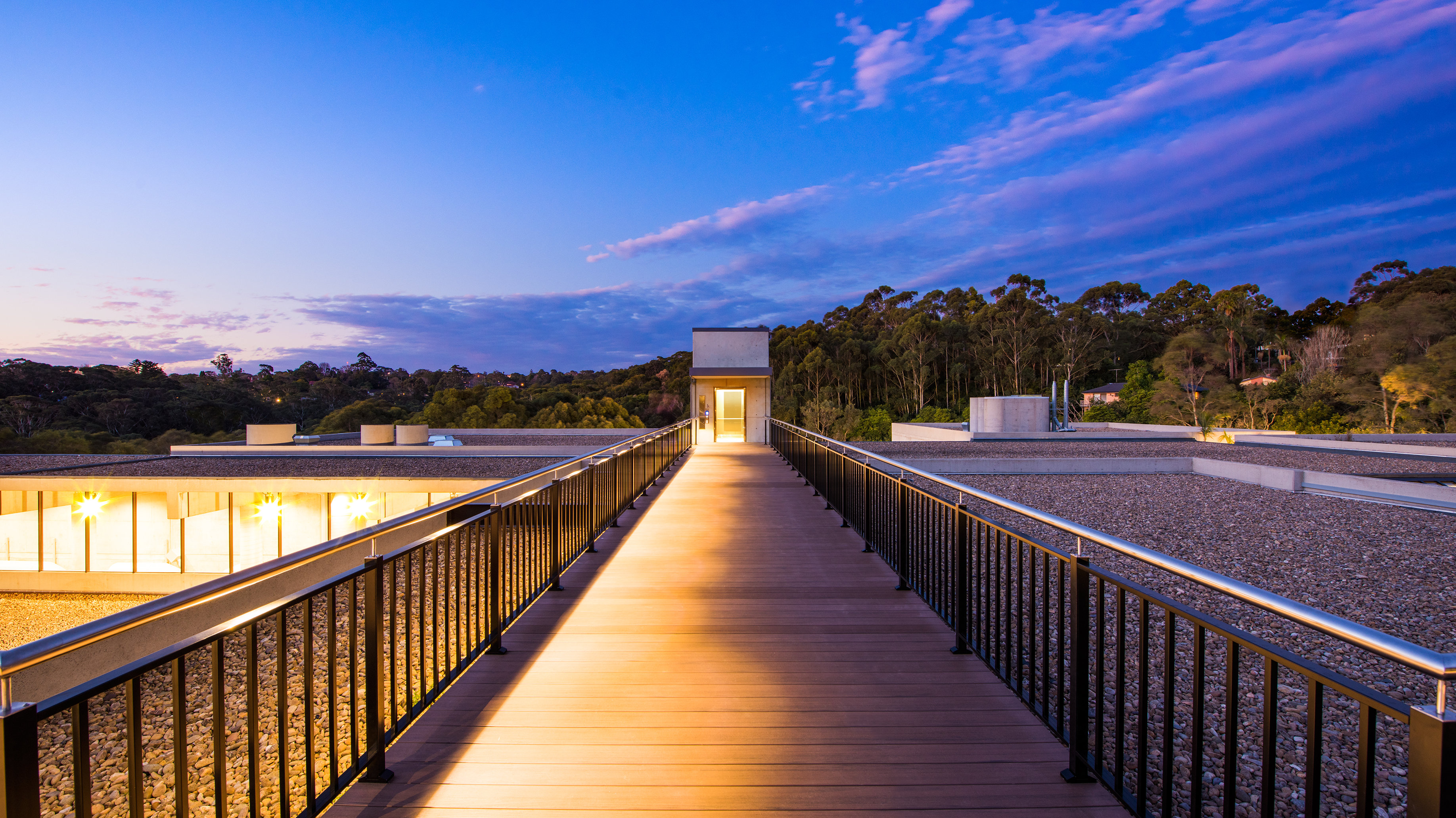 A estrutura ultramoderna apresenta um estilo minimalista com vários andares de vidro para uma impressionante paisagem de betão. Lá fora, a Blue Gum Creek segue a sua jornada através de 3 hectares de floresta de eucalipto nativo, literalmente um Jardim do Éden no centro da área metropolitana de Sydney.