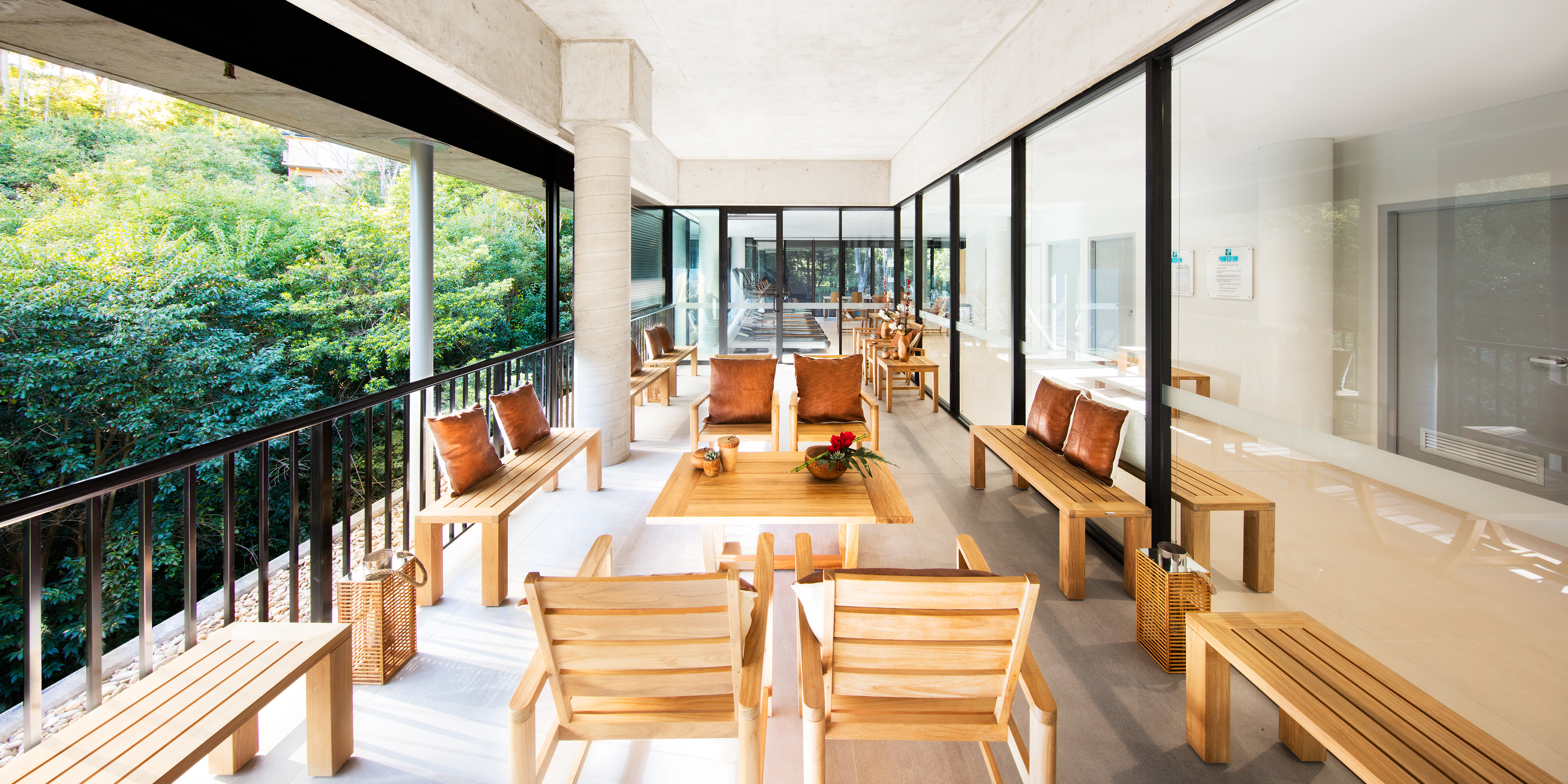 Com vistas deslumbrantes da floresta nacional, o terraço exterior fornece um ponto de encontro excecional para os Scientologists em serviços e convidados que participam nos muitos eventos programados da Igreja.