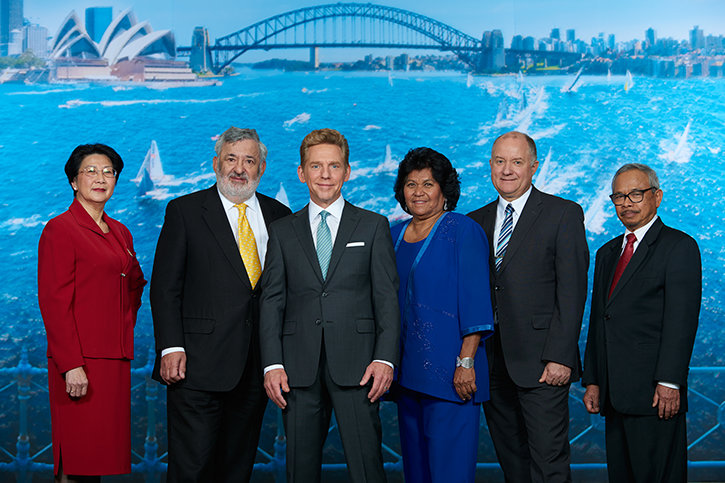 O Sr. David Miscavige com (da esquerda para a direita): a Sra. Le Lam, Presidente da Câmara Emérita e Presidente da Associação Cultural Asiática da Grande Sydney, Dr. David Bennett AC, o Conselheiro da Rainha e ex-Advogado-geral da Austrália, a Sra. Gracelyn Smallwood, Ordem da Austrália e professor James Cook Universidade, Dr. Keith Thompson, Decano Associado, da Universidade de Notre Dame, e o Dr. Amin Hady, antigo conselheiro religioso para o Primeiro-ministro australiano.