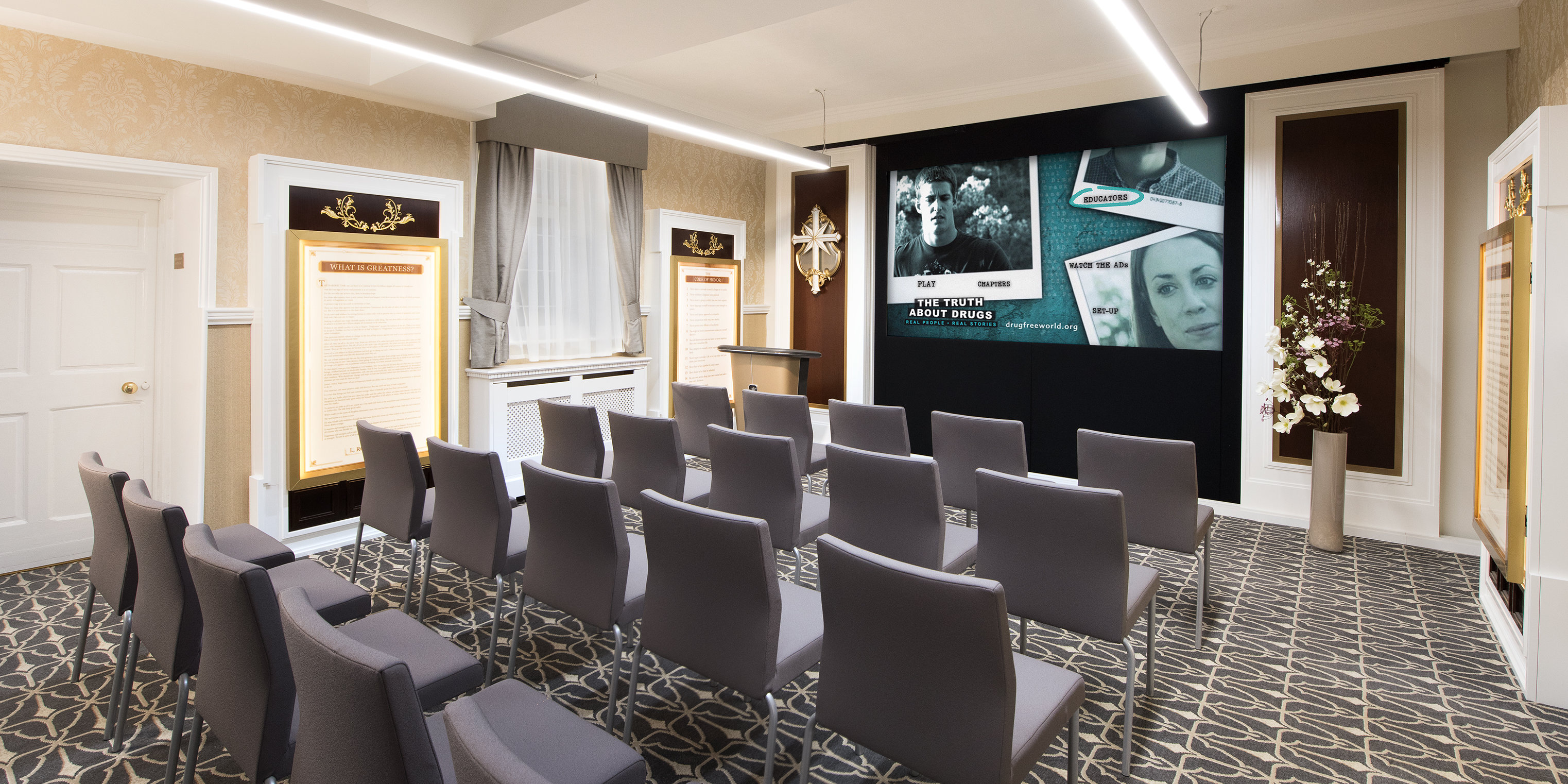 O Gabinete de Assuntos Nacionais apresenta um centro de informação completo com programas interativos e expositores audiovisuais onde os visitantes podem aprender sobre os programas de melhoramento social e humanitários de Scientology e muito mais. A tecnologia de ponta do centro permite ilustrações nítidas e detalhadas dos princípios básicos da religião e dos seus objetivos para a paz, saúde e felicidade entre todos os povos. Estes materiais detalham o extenso trabalho da Igreja em promover a tolerância religiosa e compreensão, em encorajar a consciencialização espiritual, e em ajudar a desenvolver a cooperação