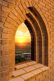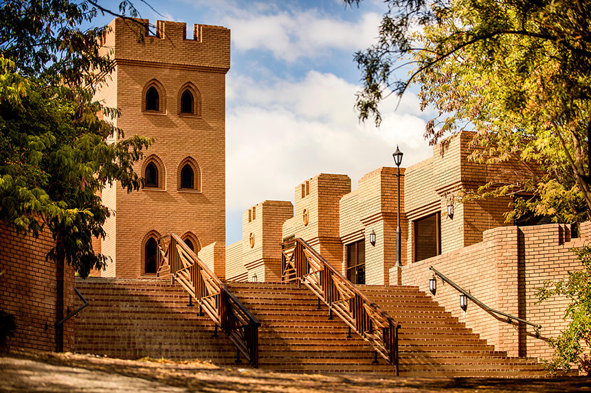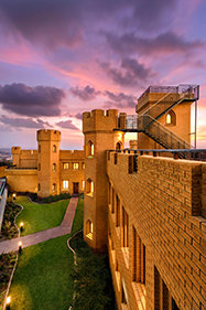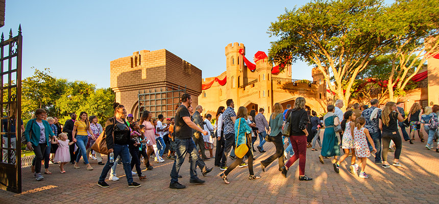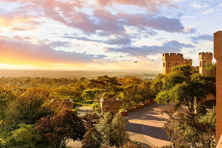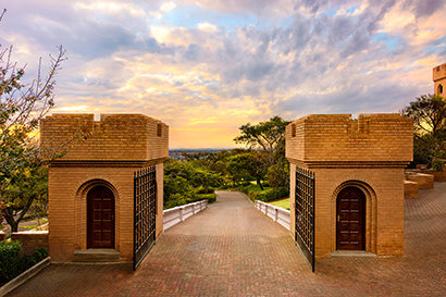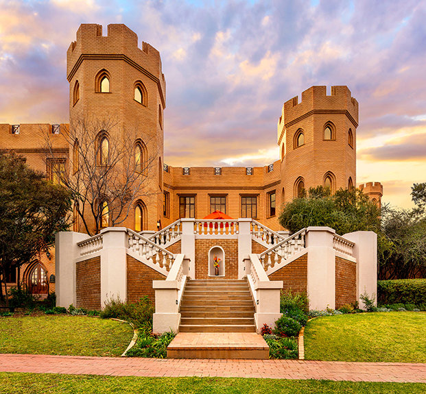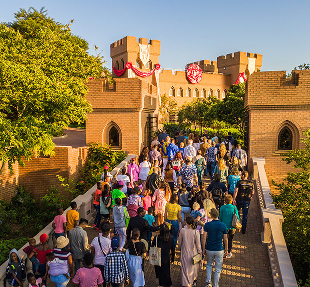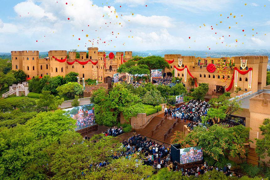 No centro desta colina celeste, em 9 hectares de terra, o Castle Kyalami de 8000 metros quadrados permanece em testemunho do compromisso da religião para ajudar a criar uma África que pode cumprir o seu potencial ilimitado. A presença do castelo reflete a aura mágica da paisagem da África do Sul à medida que este olha para os gémeos gigantes nacionais da província de Gauteng — Joanesburgo no sul e Pretória no norte. As vistas panorâmicas cativaram rapidamente os visitantes e as 12 torres de ameias do castelo e as paredes de 20 centímetros de espessura dão uma atmosfera única. O interior elegante, intensificado pelo piso em mármore italiano extraído das mesmas pedreiras usadas por Miguel Ângelo, contribui com a sua própria atmosfera especial nesta inauguração espetacular.