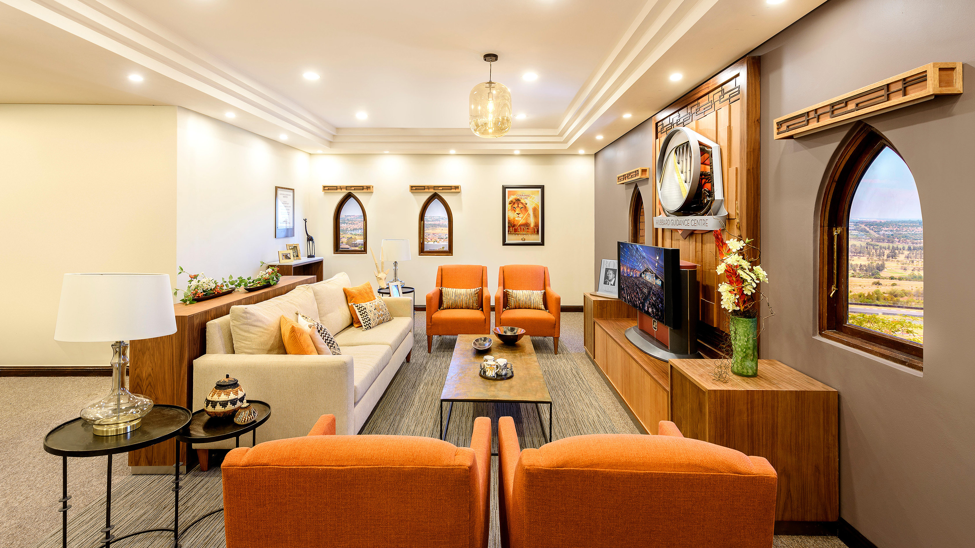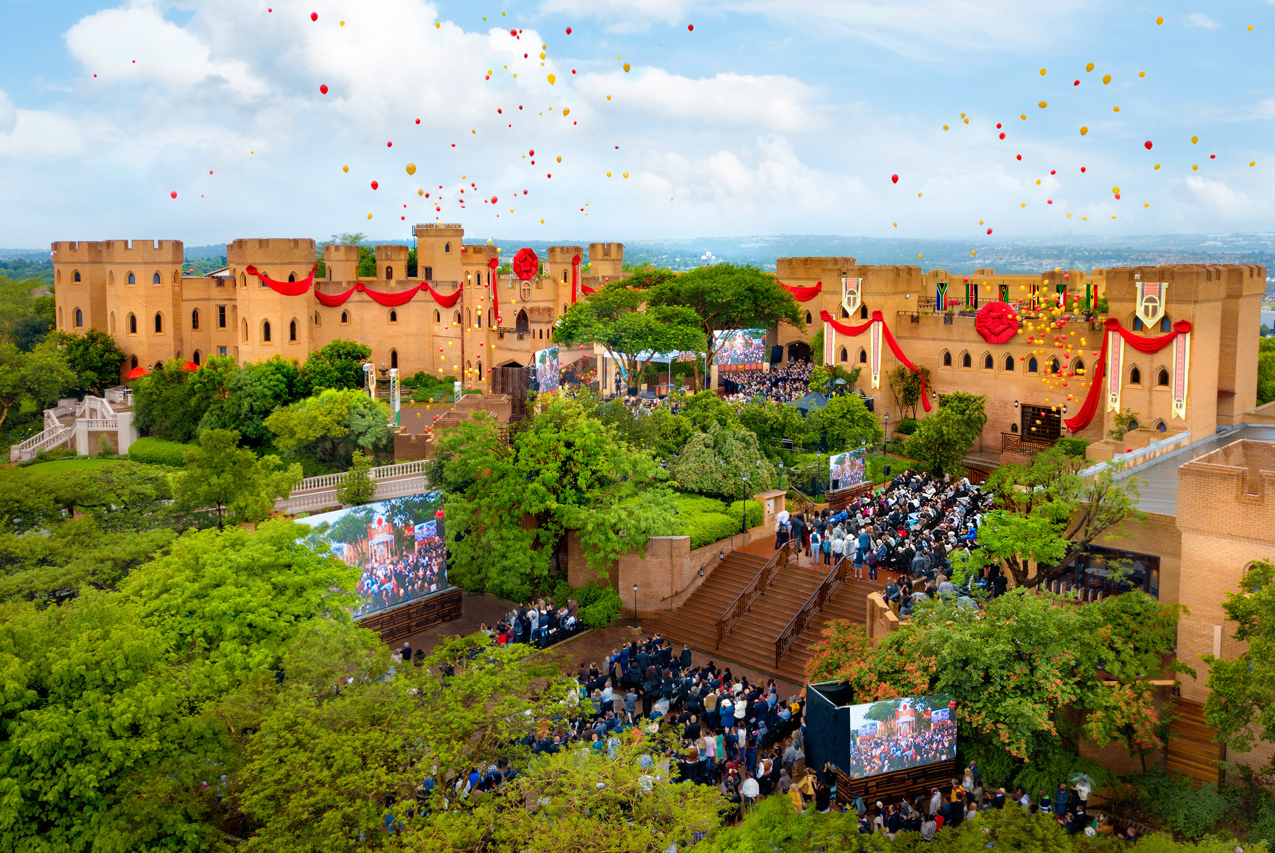 No centro desta colina celeste, em 9 hectares de terra, o Castle Kyalami de 8000 metros quadrados permanece em testemunho do compromisso da religião para ajudar a criar uma África que pode cumprir o seu potencial ilimitado. A presença do castelo reflete a aura mágica da paisagem da África do Sul à medida que este olha para os gémeos gigantes nacionais da província de Gauteng — Joanesburgo no sul e Pretória no norte. As vistas panorâmicas cativaram rapidamente os visitantes e as 12 torres de ameias do castelo e as paredes de 20 centímetros de espessura dão uma atmosfera única. O interior elegante, intensificado pelo piso em mármore italiano extraído das mesmas pedreiras usadas por Miguel Ângelo, contribui com a sua própria atmosfera especial nesta inauguração espetacular.