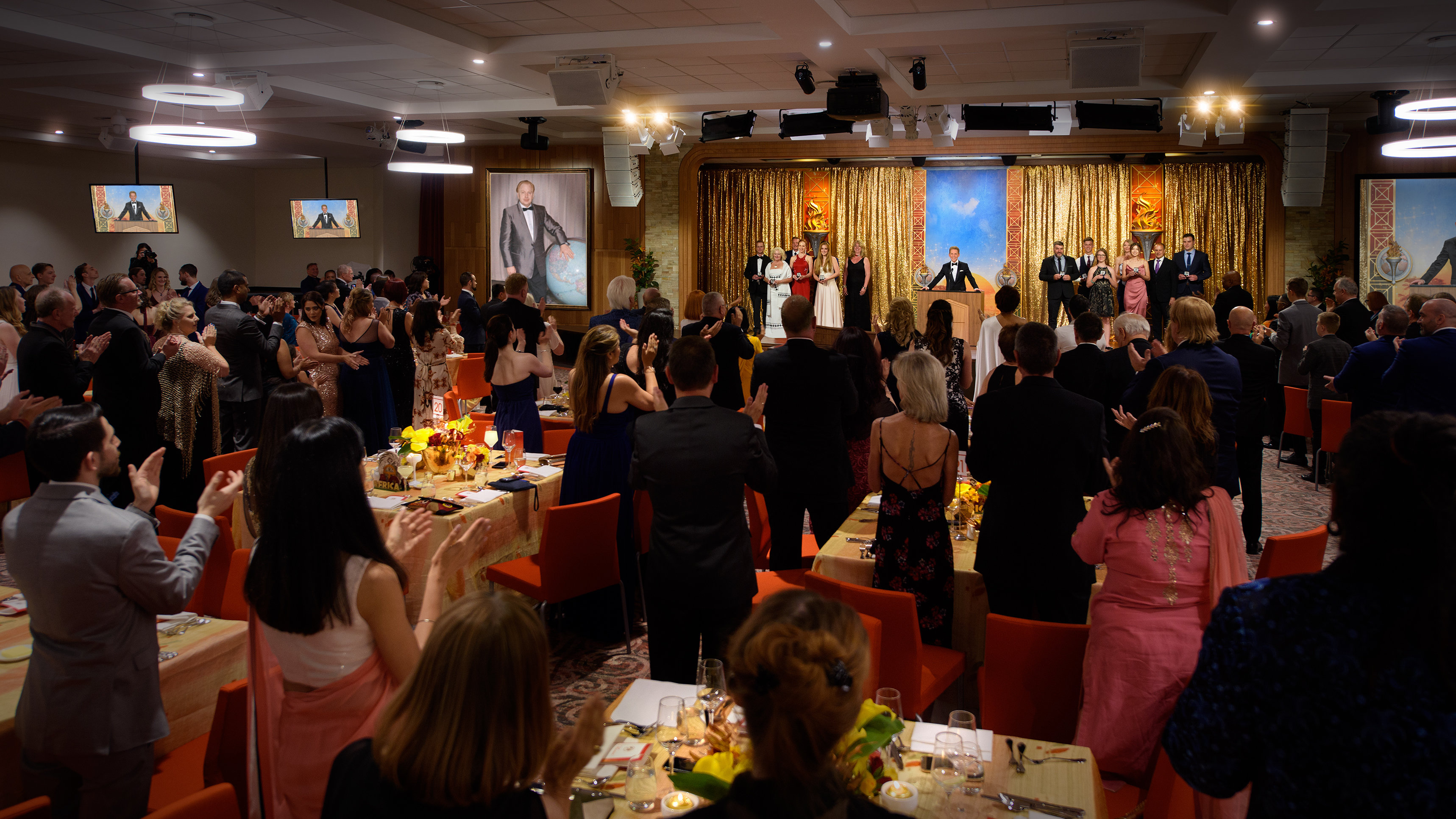 Os bravos representantes sul‑africanos da Associação Internacional de Scientologists (IAS) subiram ao palco para o primeiro Baile de Patronos Africano da IAS. A sala foi transformada numa glória dourada com panos de fundo reluzentes e arranjos de flores protea para a gala formal. O Sr. Miscavige homenageou mais de 100 membros da IAS por apoiarem os programas humanitários massivos do continente e reconheceu o seu impulso e dedicação por ajudarem a tornar esta celebração de Inauguração num sucesso. O orgulho era palpável à medida que estes Scientologists dedicados aceitavam os seus prémios. Depois dum jantar sumptuoso, as estrelas da dança abalaram a sala. A sensação das Caraíbas Michele Henderson e a lenda do hip‑hop de Harlem Doug E. Fresh estabeleceram o ritmo para o resto da noite enquanto os Patronos dançavam e festejavam.