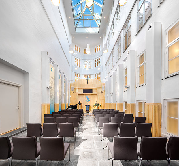 A Igreja redesenhou, restaurou e renovou o seu novo lar no centro de Copenhaga. Em 3700 metros quadrados, este edifício neoclássico foi originalmente construído em 1796 e nasceu das chamas do “Grande Incêndio” de 1795 que consumiu o distrito de Nytorv/Gammeltorv. De facto, o planeamento da cidade ordenou que a fachada distintiva com o “canto quebrado” do edifício permitisse que a longa escada do carro dos bombeiros acedesse às ruas estreitas da cidade.