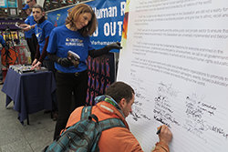 A Sra. Keogh descreveu mais detalhadamente um movimento nacional dos direitos humanos gerados nos últimos 12 meses sob a bandeira de Unidos pelos Direitos Humanos: “Todos os rapazes e raparigas no nosso programa educativo ‘Count Us In’ recebem o seu próprio exemplar do vosso folheto dos direitos humanos, em combinação com o nosso workshop de AntiBullying. De facto, 48 dos nossos voluntários estão a usar o programa, de Cork a Limerick e de Galway a Dublin. Com kits do professor sob os seus braços, eles estão a entregar seminários e palestras e deixando as sementes dos direitos humanos para trás, onde quer que vão. E com cerca de 3 mil alunos graduados no programa, estamos a construir um exército dos direitos humanos crescente.”