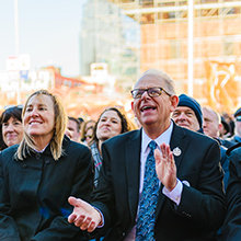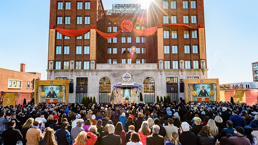 O Sr. David Miscavige, o líder eclesiástico da religião de Scientology, presidiu a cerimónia de inauguração. No seu discurso de abertura, o Sr. Miscavige sublinhou o espírito jovial do dia em honra do novo lar da Igreja do Centro‑Oeste: “Kansas City, onde, como se costuma dizer, as pessoas falam o ‘americano’ mais puro de todos os 50 estados e o churrasco é o melhor que há na galáxia gastronómica. Esta também é uma cidade onde a ‘ética do trabalho’ ainda é o que era antes da palavra ‘ética’ perder o seu significado. Por isso, sim, Kansas City aqui vamos nós!”