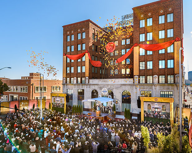 Com o cenário perfeito dum dia de sol de outono, uma multidão de mais de 1000 pessoas reuniu‑se no cruzamento da 18th e Grand para saudar uma notável nova Igreja de Scientology a abrir as suas portas.