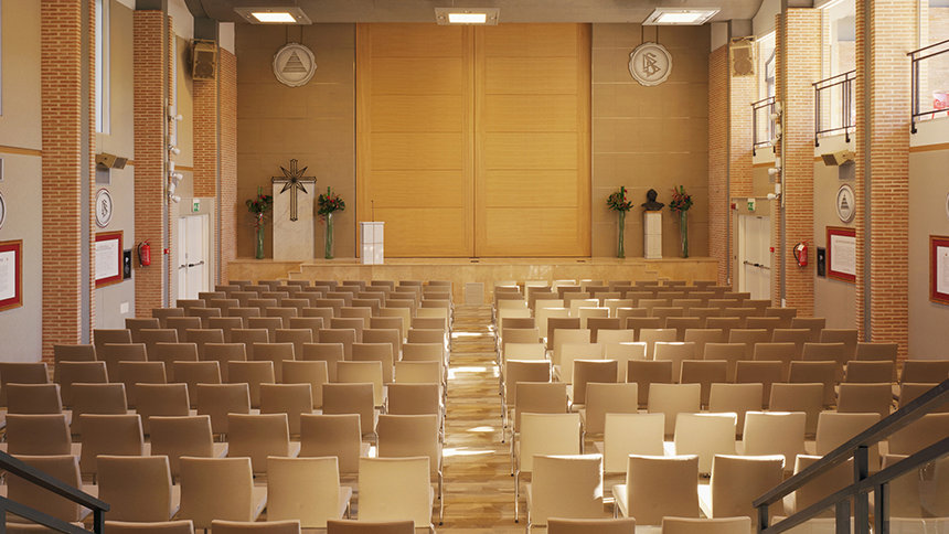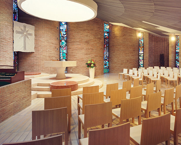 Central ao edifício está o auditório com 300 lugares para eventos da Igreja e da comunidade.