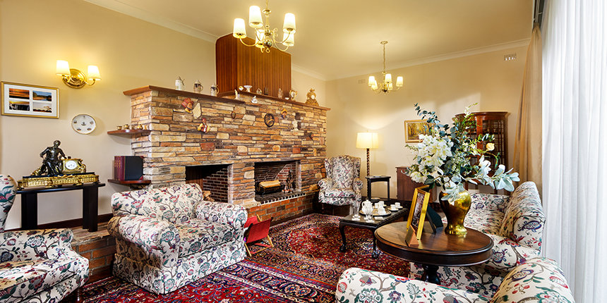 No exterior, a piscina foi restaurada à sua forma clássica e à sua cor turquesa. Mas é a lareira de pedra no interior que pode ser a mais deslumbrante — tanto pela sua beleza como pela sua notável viagem. Um proprietário posterior desmontou‑a, reutilizando as pedras numa parede de jardim. Agora, foram recuperadas por especialistas em restauro, limpas à mão e devolvidas com diligência à sua forma original e requintada — observadores calorosos de inúmeras histórias, prontos a revelar esses momentos a todos os que visitam este marco.