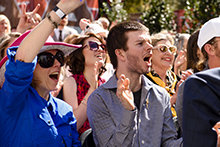 Uma multidão exultante saúda o corte da fita na capital, celebrando a liberdade do Texas no corredor social principal da cidade: The Drag.