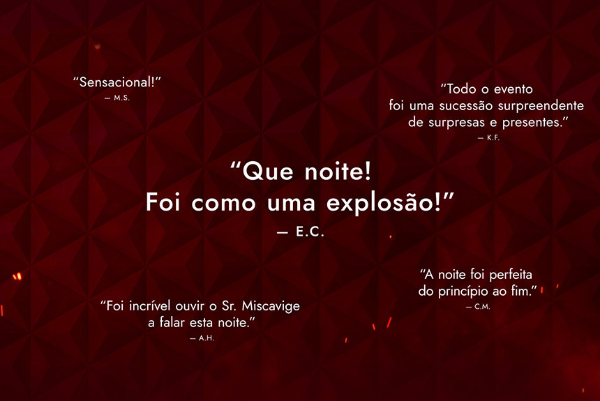 Esta noite, Scientologists de mais de 70 nações reuniram‑se no Ruth Eckerd Hall de Clearwater numa celebração radiante do legado de Dianetics. O momento brilhou ainda mais com o anúncio de tudo o que estava para vir — novas jornadas, novas fronteiras e novas oportunidades — tudo levando o poder transformador de Dianetics mais longe do que nunca.