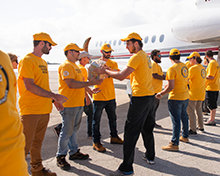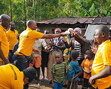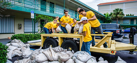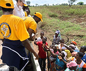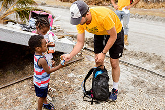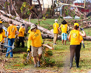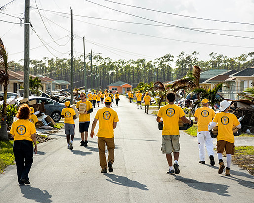 - Prestando ajuda e socorro nos locais de desastre por todo o mundo, quer seja terremotos no Haiti, furacões na Florida, incêndios na Califórnia, ciclones em Moçambique, chuvas torrenciais e deslizamentos de terra no Uganda, monções no Nepal ou tempestades devastadoras na Grande Bahama.