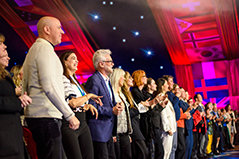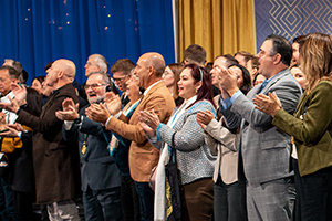 Os membros da IAS e os convidados levantam‑se em reconhecimento do trabalho de salvar vidas e de mudar vidas dos Ministros Voluntários de Scientology durante o ano passado.