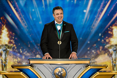 O Sr. David Miscavige, líder eclesiástico da religião de Scientology, sobe ao palco na Grande Tenda diante da multidão energizada que aguarda o início de uma noite inesquecível.