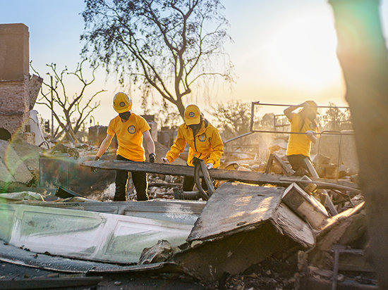 A maior força de VMs de sempre em solo americano, cerca de 2500 Ministros Voluntários a responder a incêndios históricos em Los Angeles. As chamas arderam durante dias, desde a costa do Pacífico até às montanhas, queimando uma área duas vezes maior do que Paris e causando evacuações em massa. Os VMs ajudaram quase 10 000 habitantes de Los Angeles num só dia — mais de 100 000 no total — fornecendo logística, sustento e ajuda espiritual aos primeiros socorristas e respondendo ao apelo de mais de 70 agências de resposta a emergências.