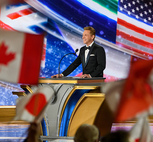 O Sr. Miscavige dá as boas‑vindas aos Scientologists e convidados para uma noite repleta de cor e triunfo, enquanto as bandeiras acenam, os espíritos se elevam e a multidão se levanta de alegria.