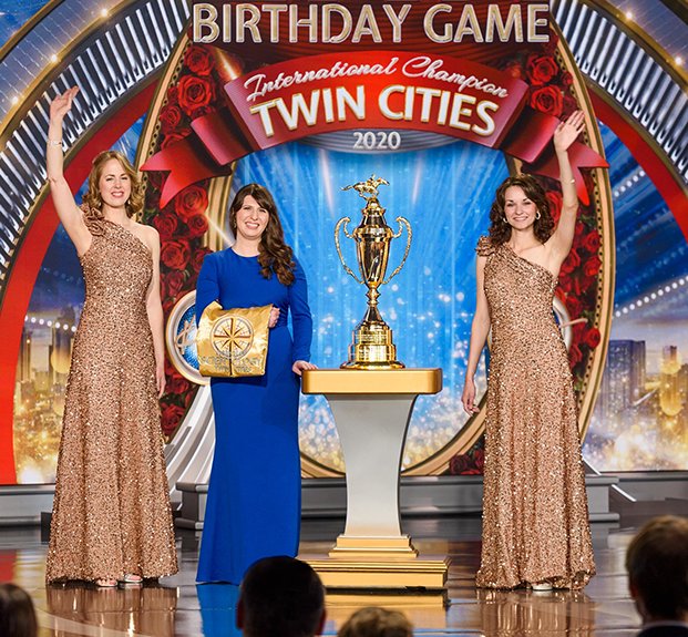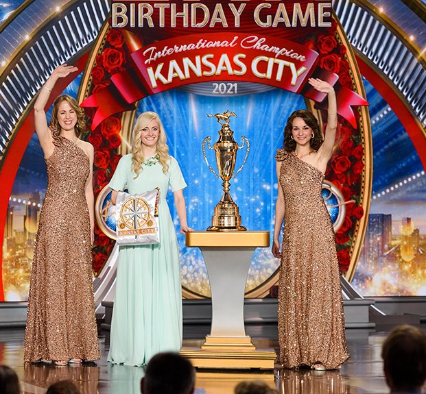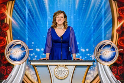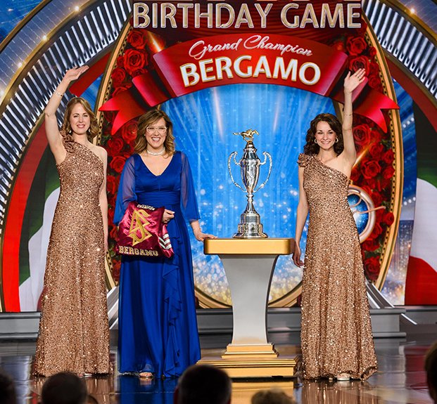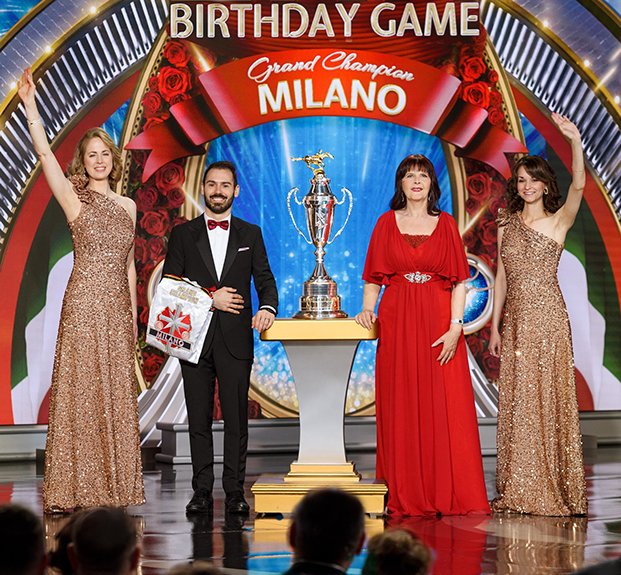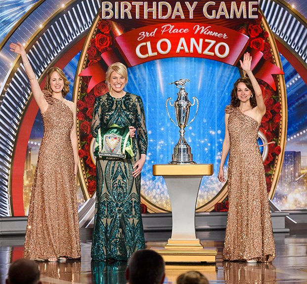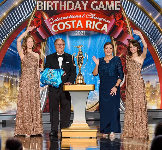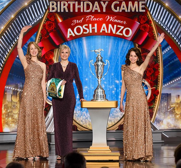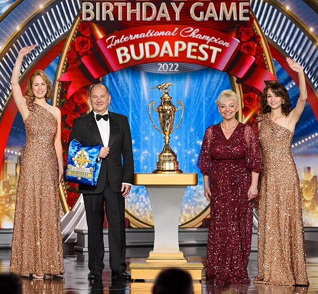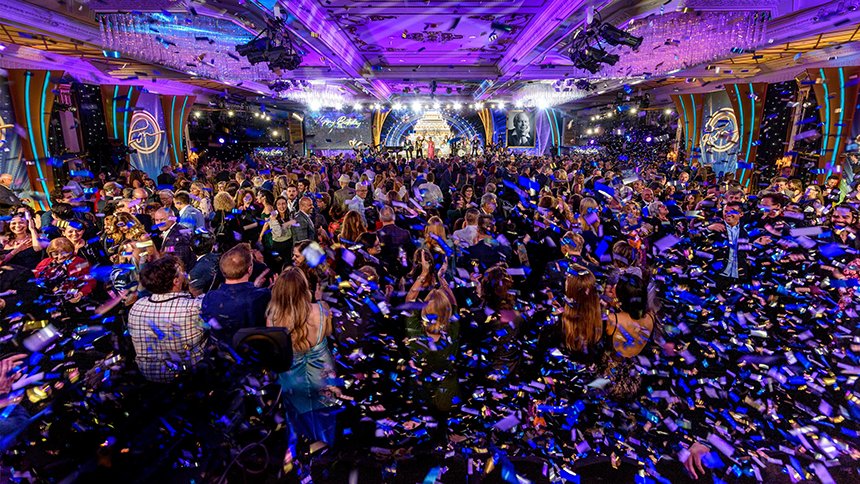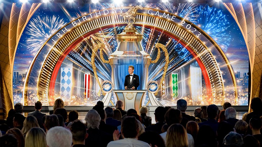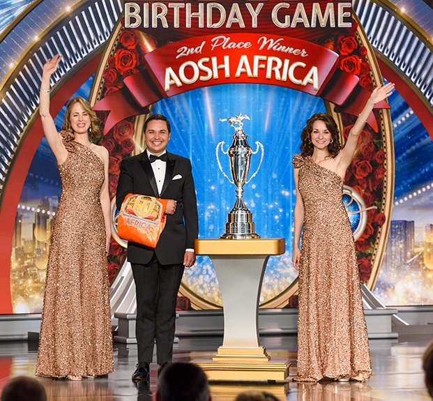 A seguir veio o momento para anunciar os campeões do Jogo de Aniversário de LRH. O palco transformou‑se num círculo de vencedores com uma moldura de rosas, completo com luzes brilhantes, camisolas de corridas e troféus brilhantes. O Jogo de Aniversário continua a tradição de honrar o Sr. Hubbard com o presente de expansão em todas as Igrejas de Scientology.