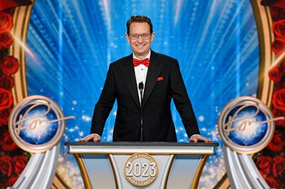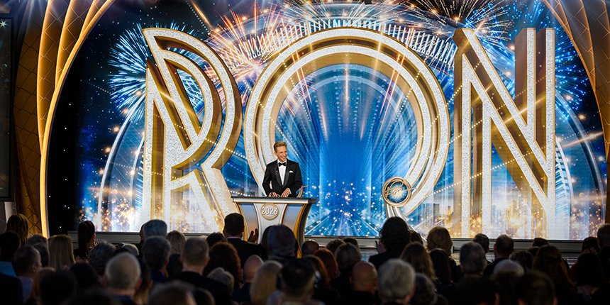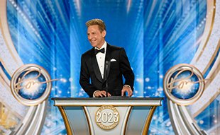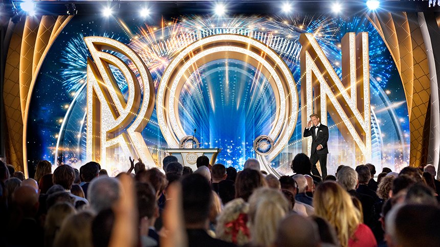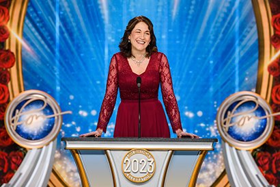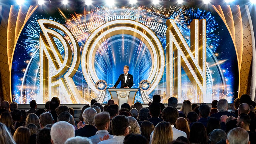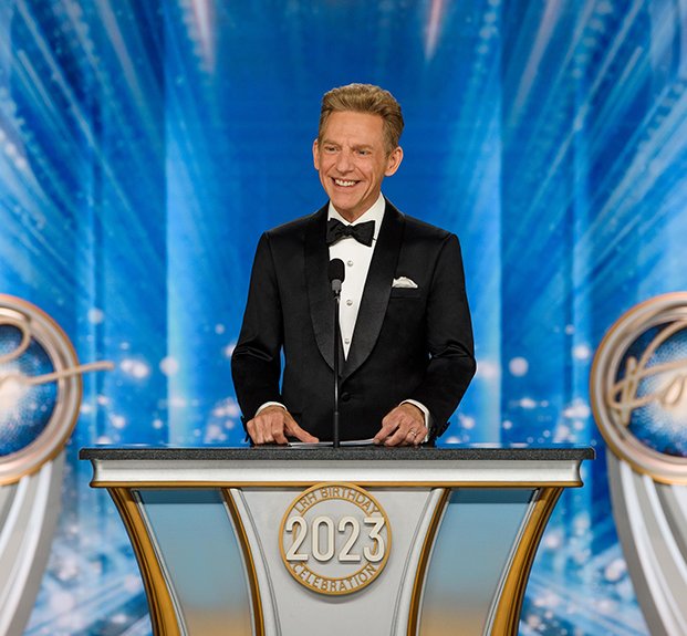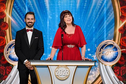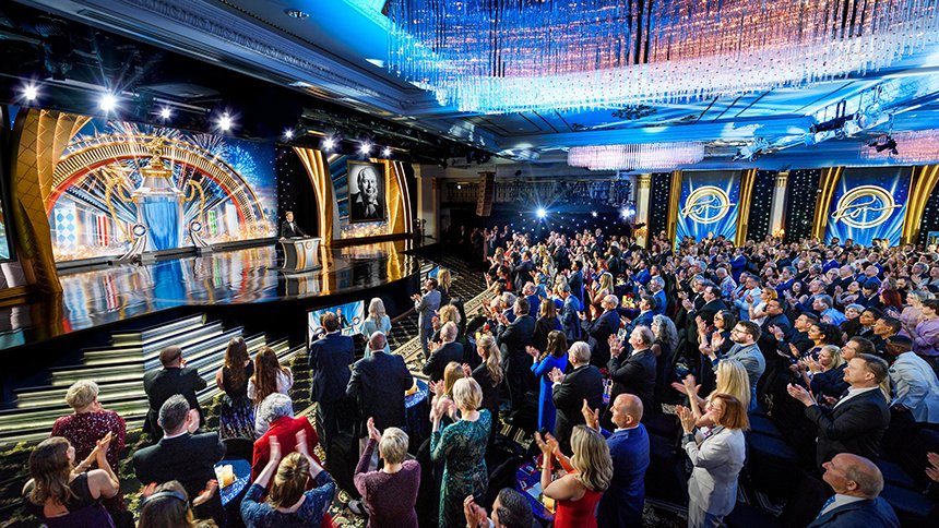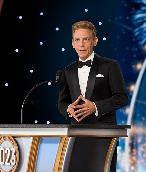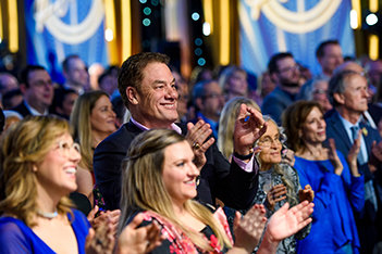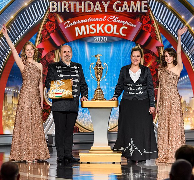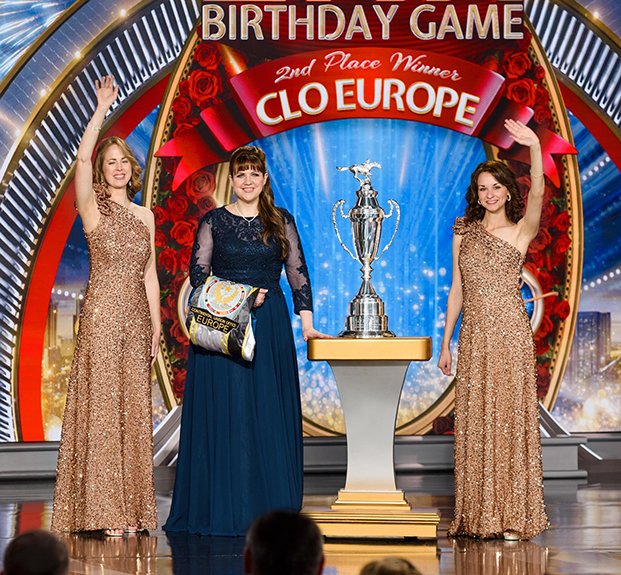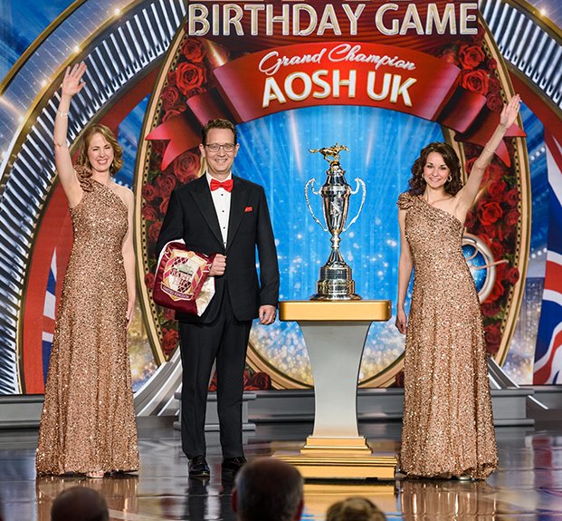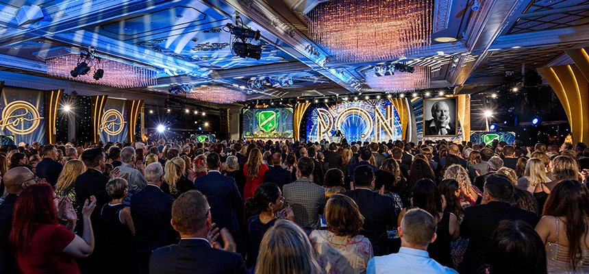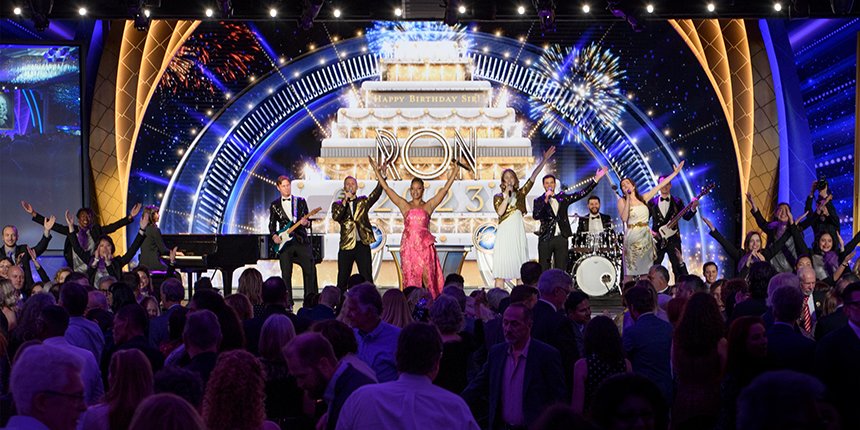 A seguir veio o momento para anunciar os campeões do Jogo de Aniversário de LRH. O palco transformou‑se num círculo de vencedores com uma moldura de rosas, completo com luzes brilhantes, camisolas de corridas e troféus brilhantes. O Jogo de Aniversário continua a tradição de honrar o Sr. Hubbard com o presente de expansão em todas as Igrejas de Scientology.