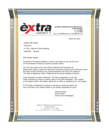 A interação do Freewinds e a tripulação com a sociedade mostra que “não estendem apenas a mão ou fazem um favor, mas têm uma responsabilidade social”, disse o Ministro para Infraestruturas e Portos de Santa Lúcia, num tributo em vídeo. “Esta é uma paixão de amor, de sinceridade e de verdadeira amizade e felicidade.”