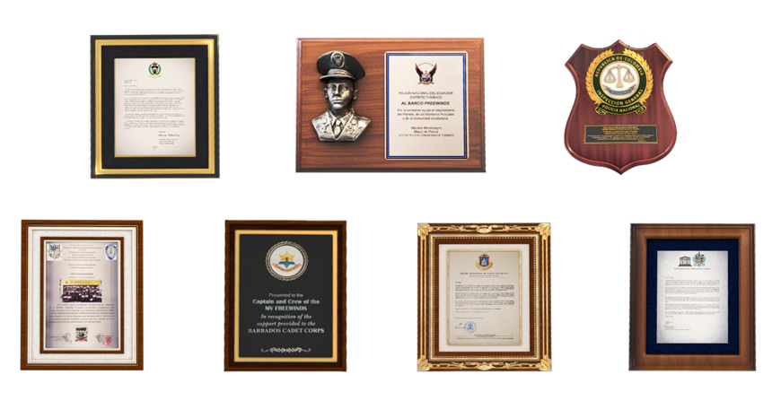 Até à data, os esforços de caridade intermináveis do Freewinds deram mais de 450 prémios, reconhecimentos e proclamações sinceras de todos os seus amigos das Caraíbas, incluindo todas as ilhas e portos que frequenta: Antígua, Dominica, São Martinho, São Cristóvão, Tortuga, Virgin Gorda, São Vicente, Barbados, Granada, Aruba, Bonaire, Curaçau, Freeport e Nassau.