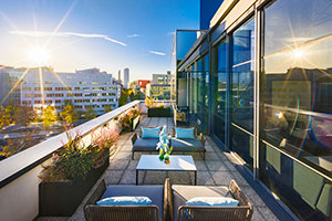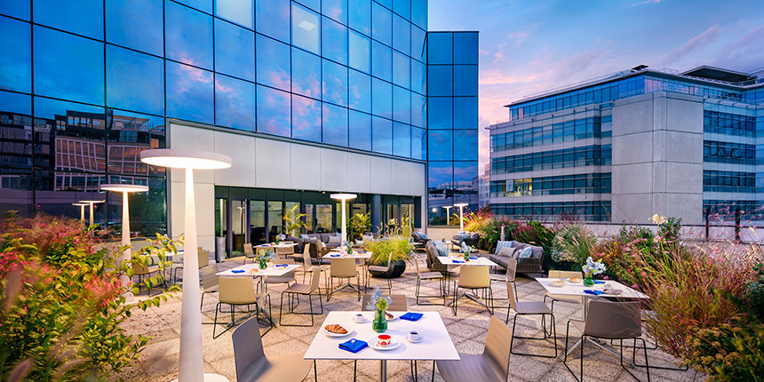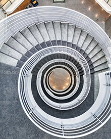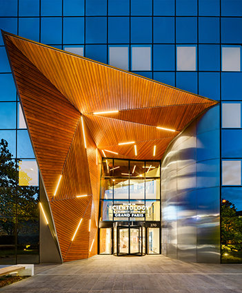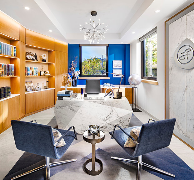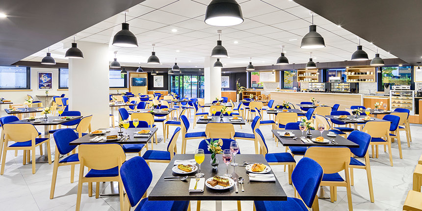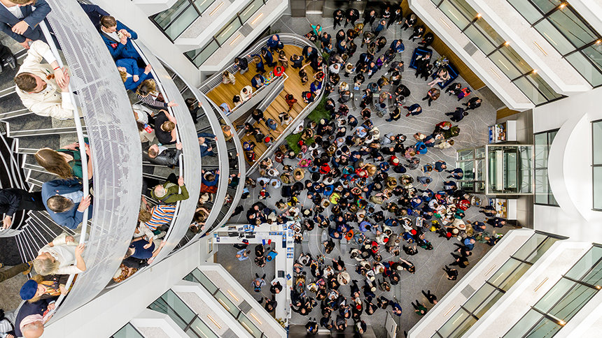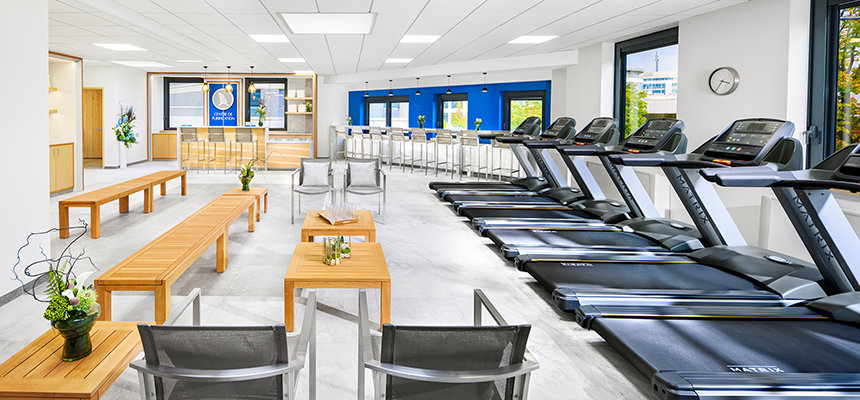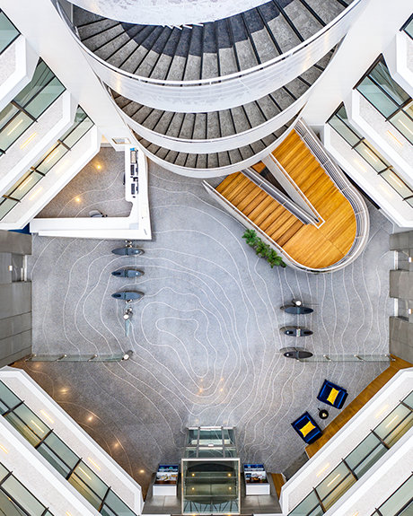 Para além do exterior reluzente e do portal de madeira geométrico e moderno, o átrio elevado das instalações no interior reflete a presença de uma árvore sequoia encantadora. Os “anéis de crescimento” individualmente introduzidos no chão terrazzo e uma balaustrada circular alinhada com um padrão de folhas estendem o tema da sequoia à medida que os convidados sobem o espaço com cerca de 15 metros de altura, iluminado naturalmente pela enorme claraboia.